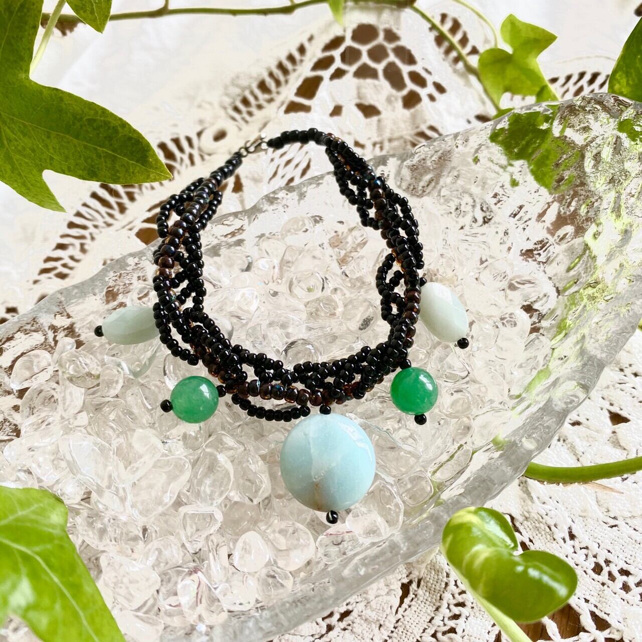 グリーンアベンチュリン…別名グリーンクォーツァイト。森林のような緑を思わせる癒やしの石です。どんな石ともうまく馴染みやすい穏やかな石で、健康の維持や促進に役立つと言われています。