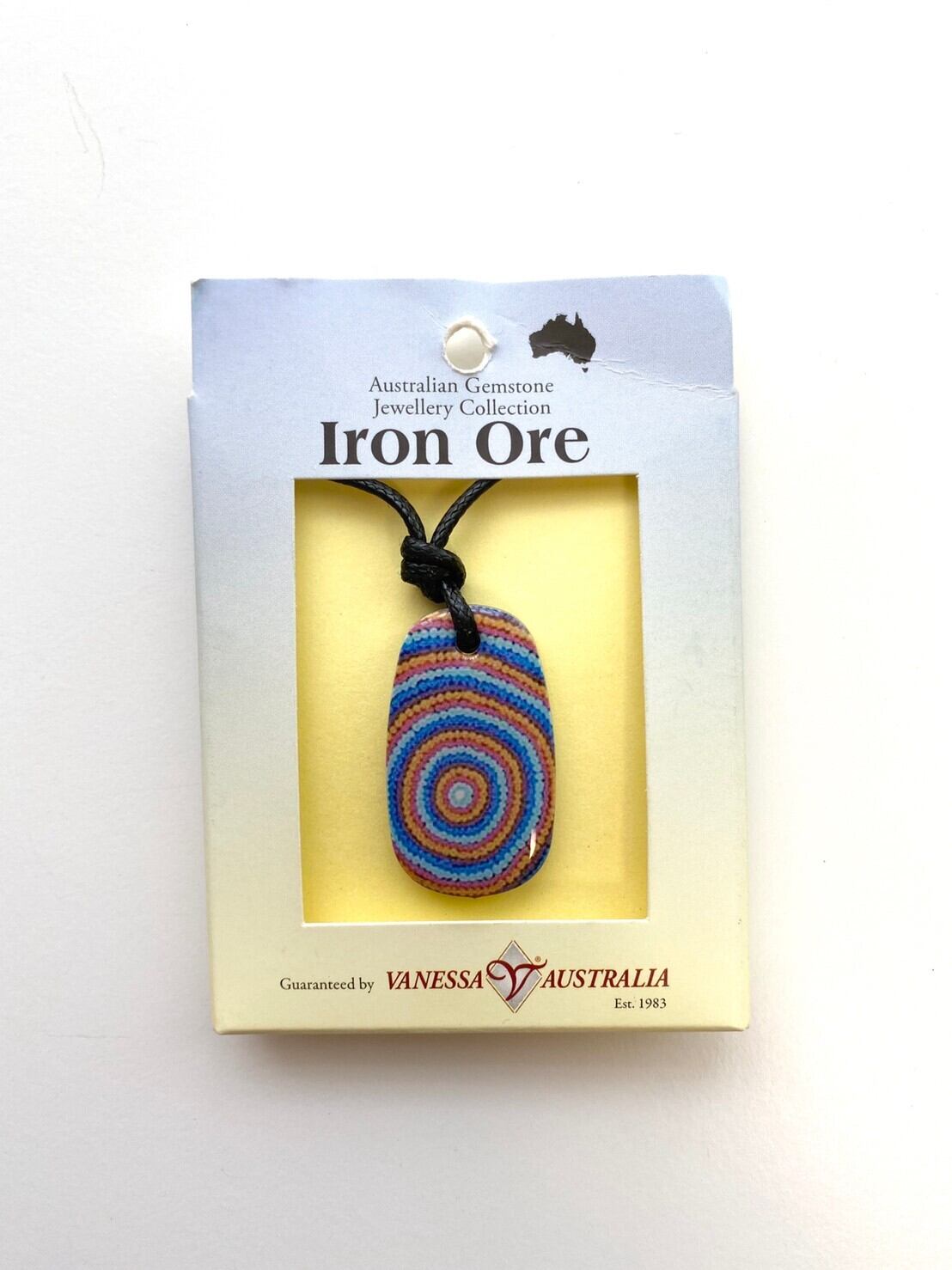 オーストラリア産のヘマタイトの上に、オーストラリアの先住民アボリジニの点描画がプリントされています。