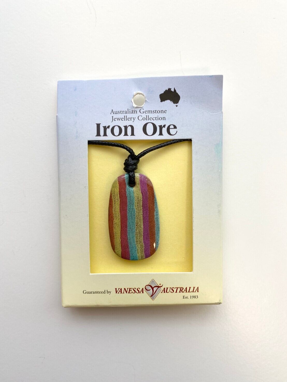 オーストラリア産のヘマタイトの上に、オーストラリアの先住民アボリジニの点描画がプリントされています。