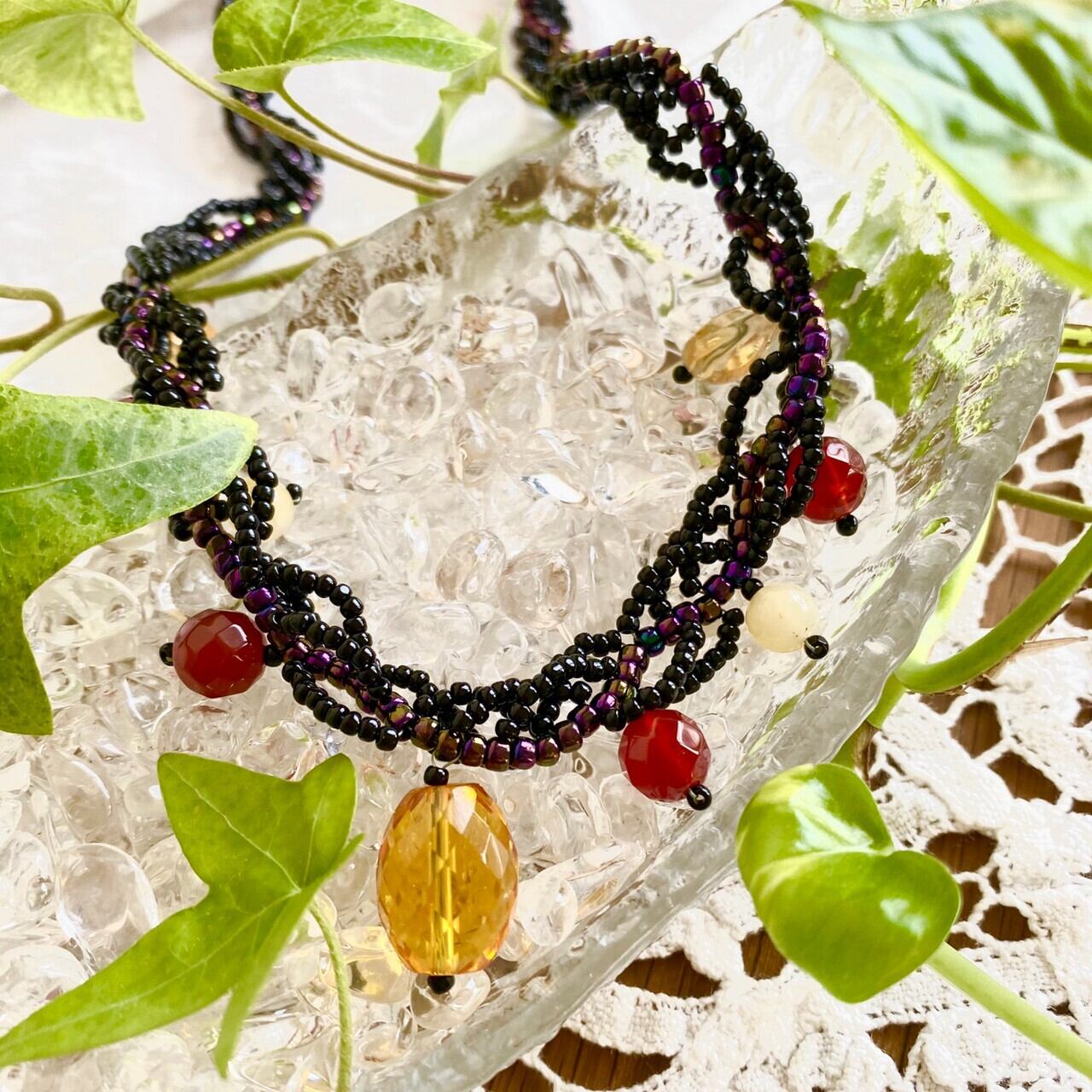 黒と紫系のビーズをふんだんに使用した、大人っぽい印象の色合いとなっています。