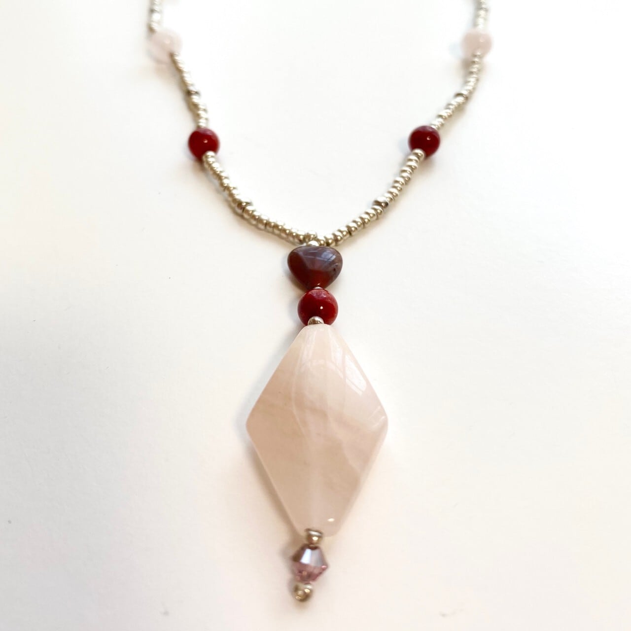 ひし形のようなユニークな形のトップはローズクォーツです。