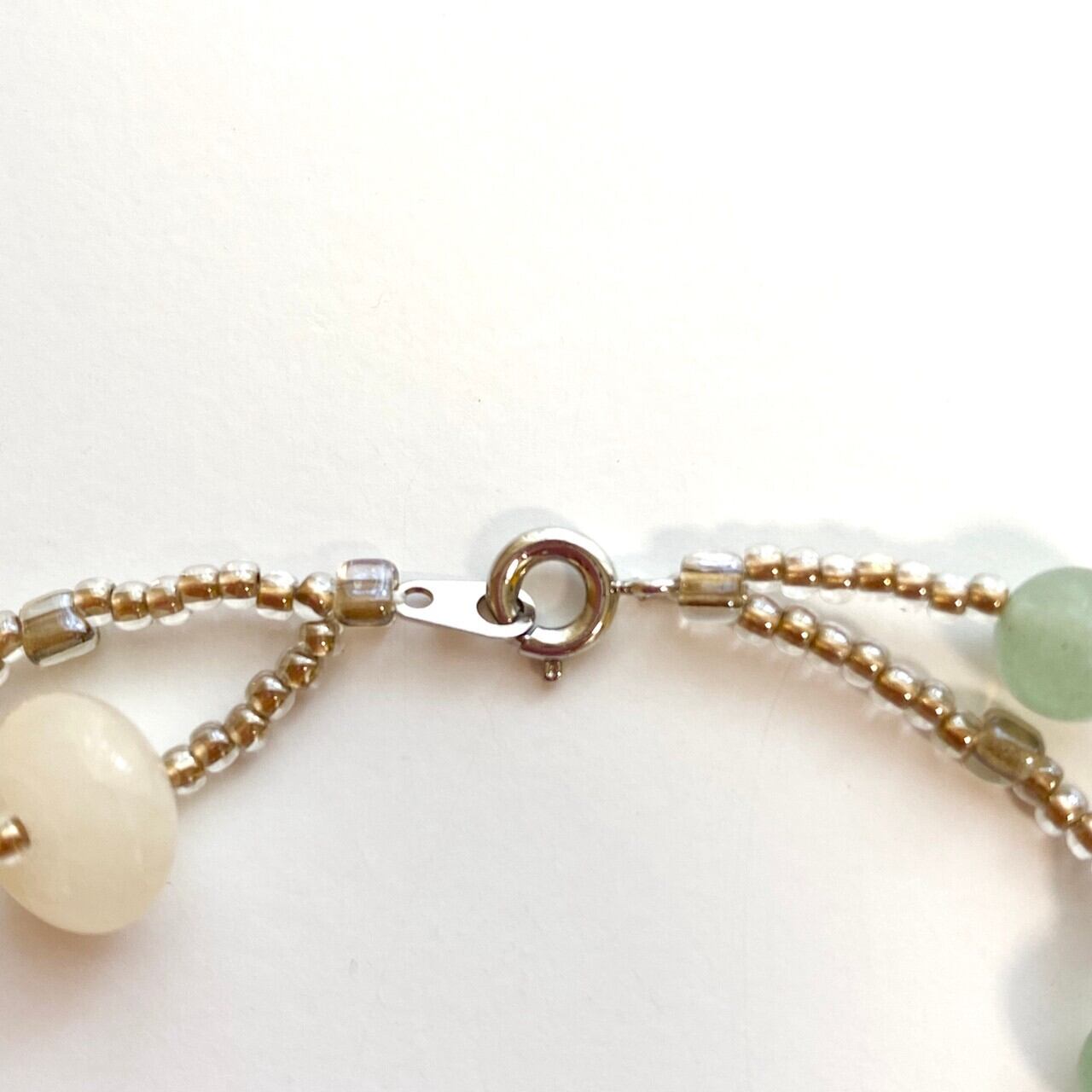 丸くて透明感のある水色のフローライトを中心に、タイガーアイ等いくつかの天然石を組み合わせた、さわやかでポップな二連のブレスレットです。