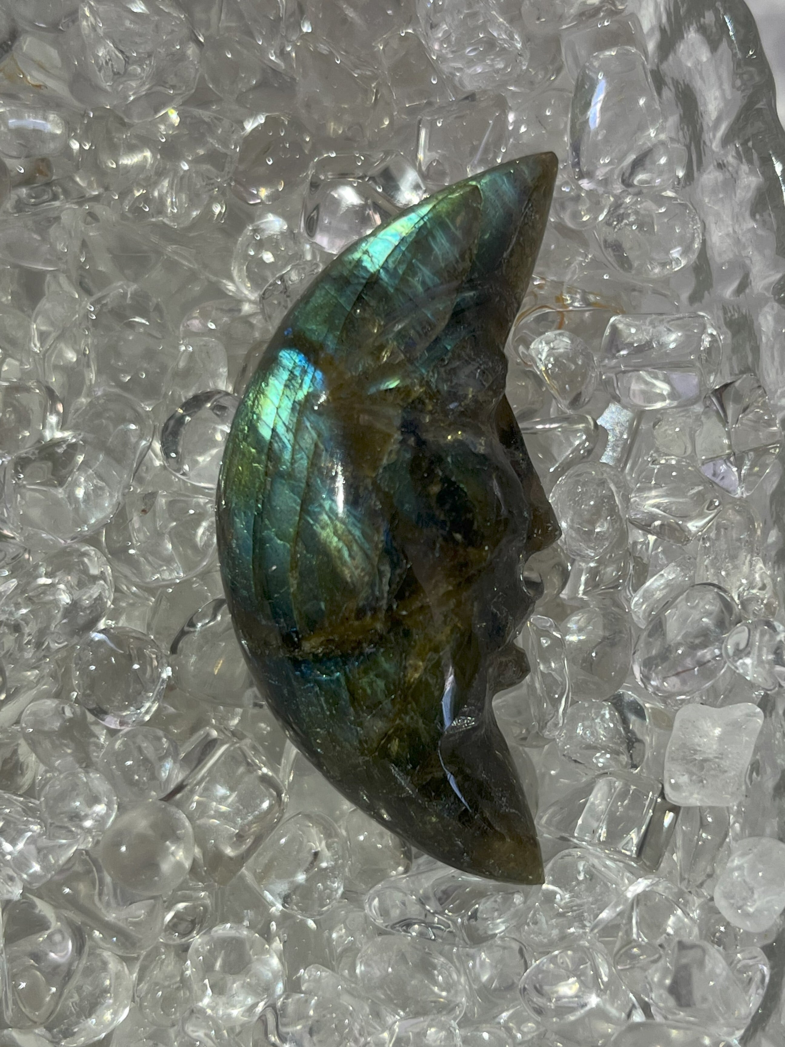 神秘的なブルーとグリーンの色合いが美しいラブラドライトで作られた、半月型のお月様です。