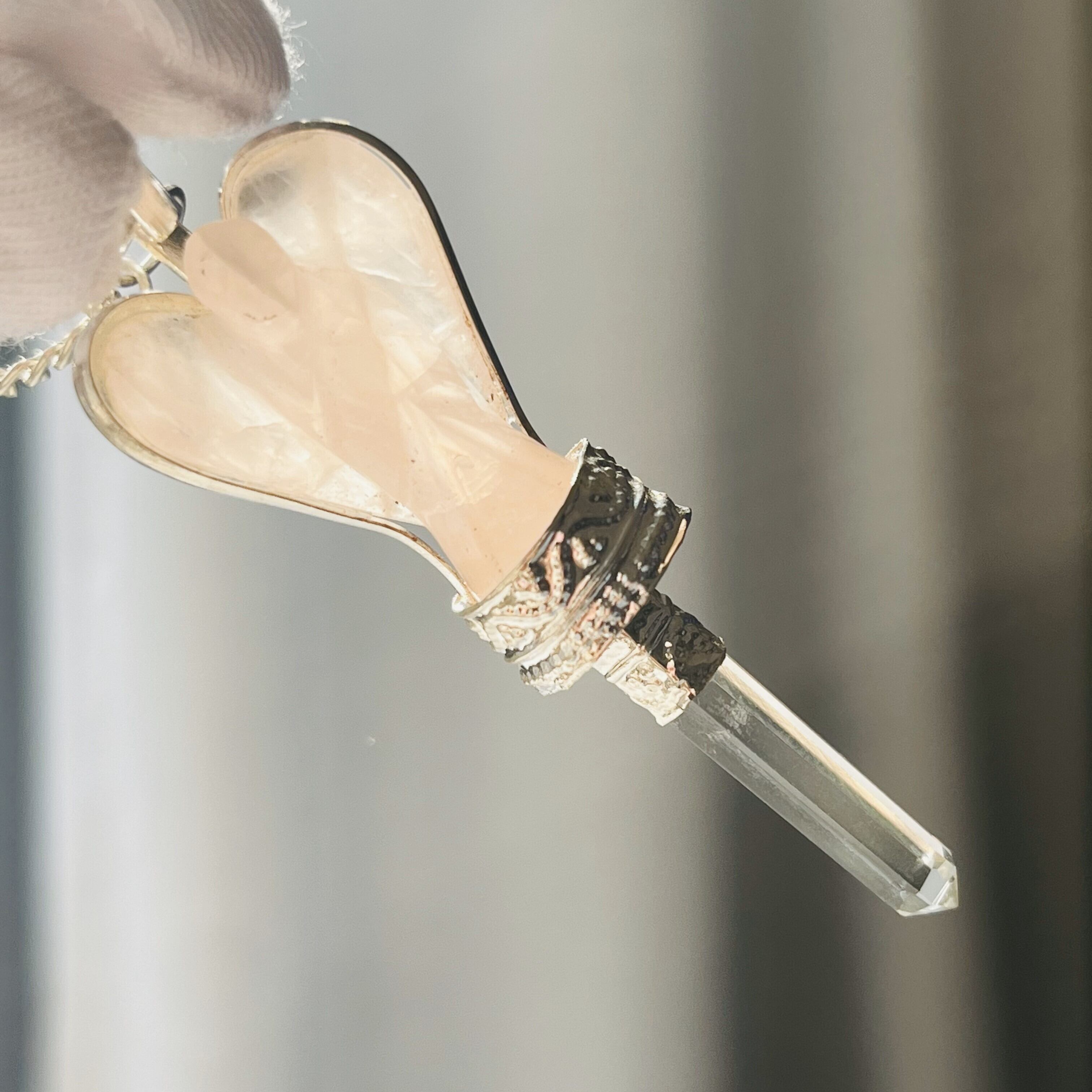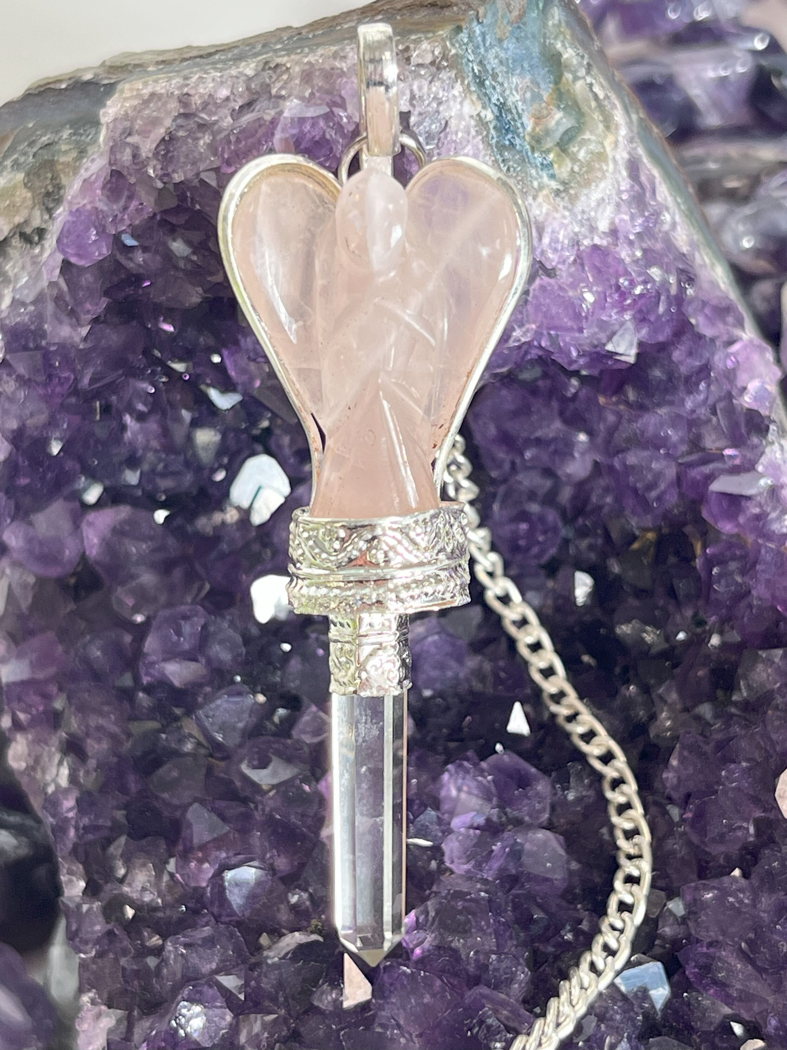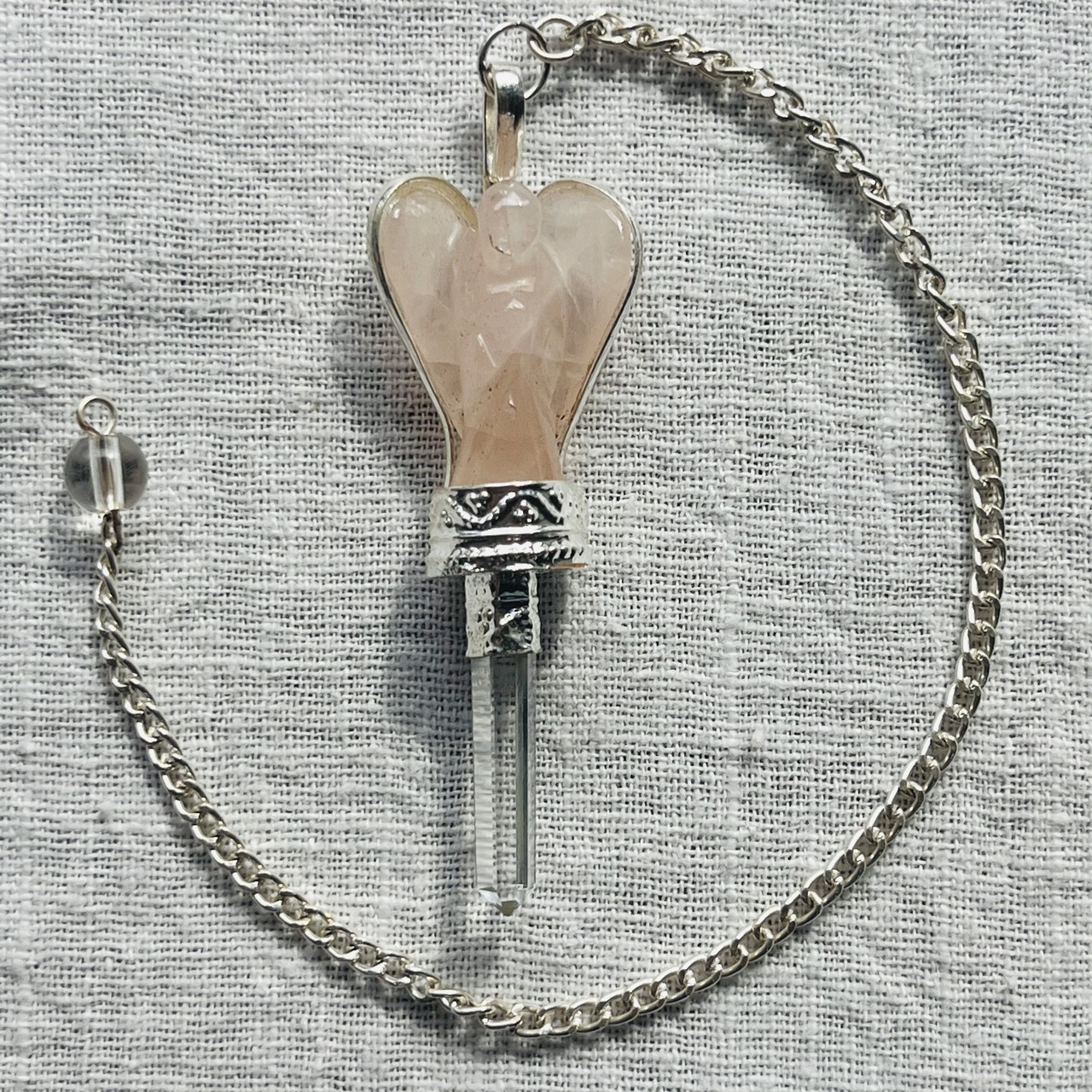 美しいローズクォーツで作られた天使像のペンデュラムです。